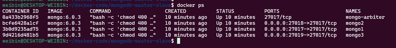 执行 docker compose up -d 启动容器。将启动四个 MongoDB 实例: